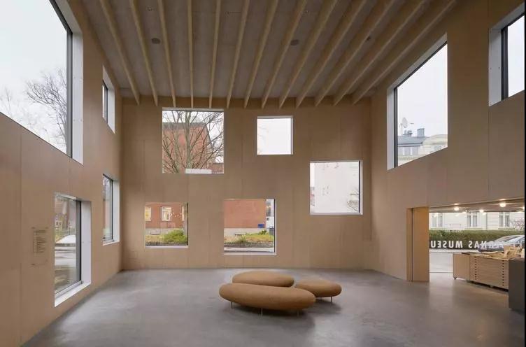 新的入口取代了 Hans Westman 在 1959 年建造的大廳,現(xiàn)在它包括商店和接待區(qū)。建筑外部使用了常見的耐候鋼材 Corten 鋪設(shè),使它具有獨(dú)特的生銹質(zhì)感,與相鄰的老紅磚建筑和博物館本身的粗糙混凝土墻完美地融合。另外,建筑師還給建筑設(shè)計(jì)了不同大小的窗口,它們?yōu)榻ㄖ肓斯饩€和開闊的景觀。