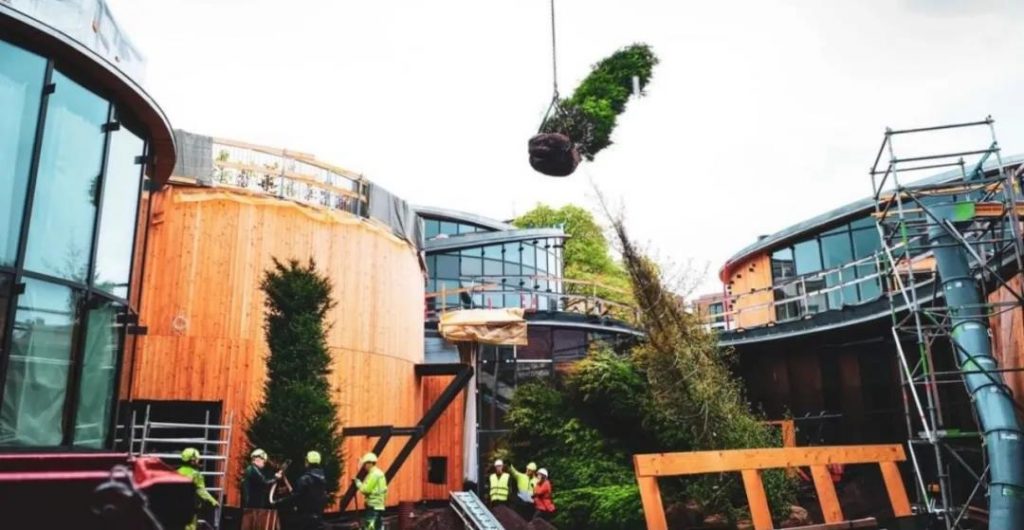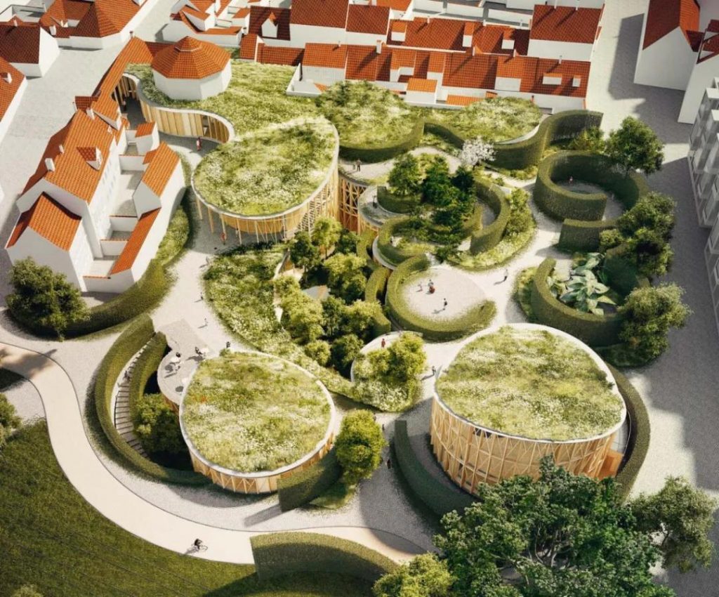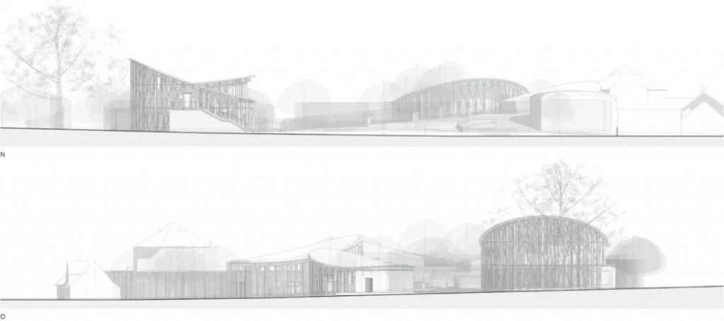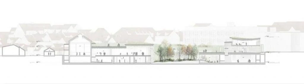 在原本紅瓦白墻、平面排列的方方正正的小鎮(zhèn)中,隈研吾插入了一個(gè)個(gè)用玻璃和木材圍護(hù)的圓柱體,共占地9000㎡,地面和屋頂都種滿了綠色植物。從小鎮(zhèn)的上空俯瞰,就像中央種了一棵棵茂密的大樹。